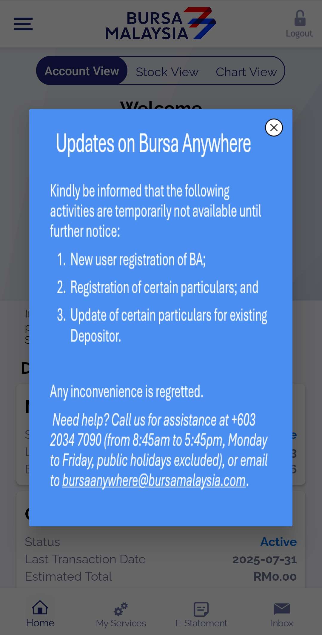 Aplikasi Bursa Anywhere tidak dapat diakses buat sementara waktu. Oleh itu, aktiviti seperti berikut tidak dapat dilakukan.