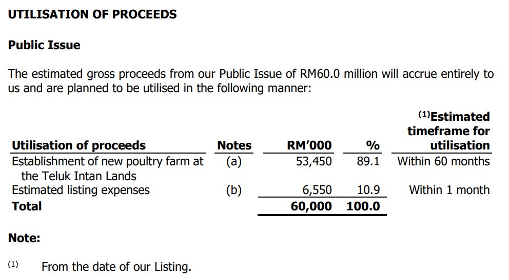Hampir 90% dana IPO (RM53.45 juta) akan digunakan untuk membina ladang ternakan moden baharu di Teluk Intan bagi meningkatkan kapasiti pengeluaran sebanyak 93.9%.