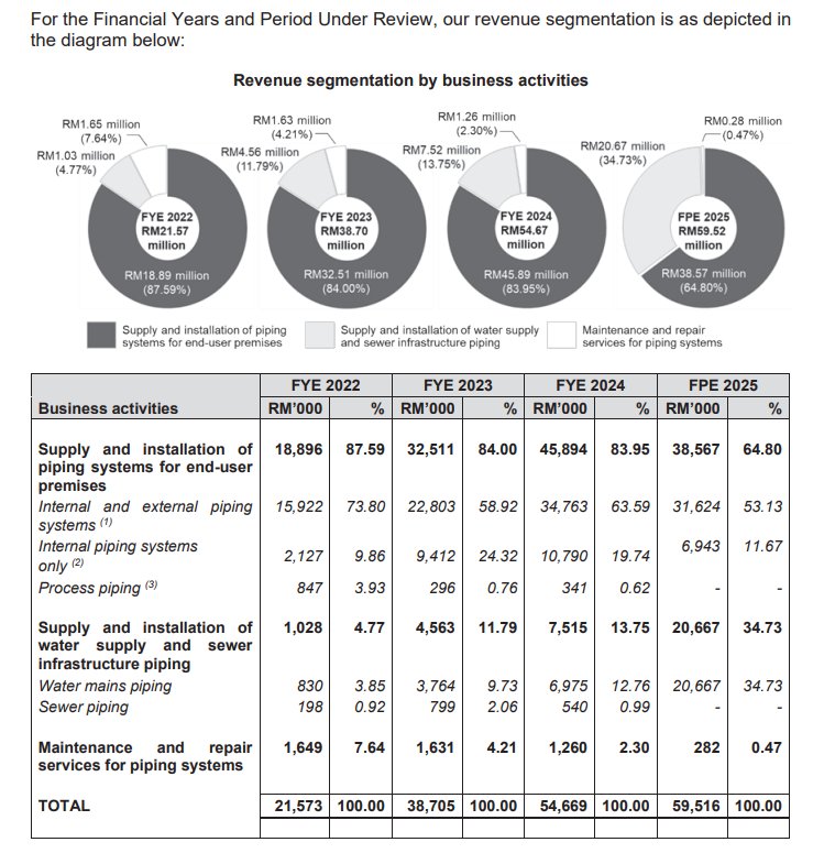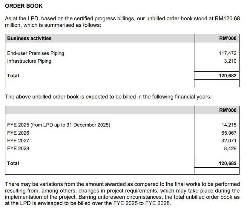 Jumlah ini memberikan earnings visibility kepada syarikat dari tahun kewangan 2025 sehingga 2028. Pecahan utama Order Book ini adalah daripada segmen sistem paip premis pengguna akhir (seperti kilang dan pusat data) yang bernilai RM117.47 juta, manakala baki RM3.21 juta adalah daripada projek infrastruktur. Angka ini menunjukkan bahawa syarikat mempunyai aliran kerja yang stabil untuk jangka masa sederhana tanpa perlu terlalu bergantung kepada tender baharu semata-mata dalam tempoh terdekat.