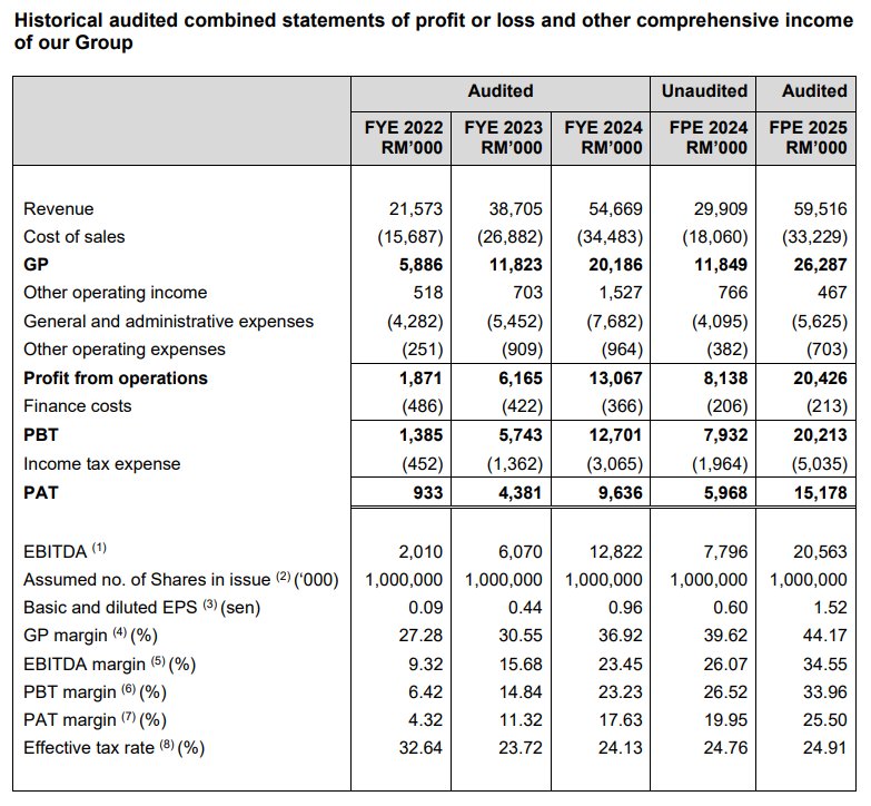 Bagi tempoh kewangan 7 bulan berakhir 31 Julai 2025, syarikat telah mencatatkan pendapatan yang melebihi pendapatan setahun penuh FYE 2024. Lonjakan PAT Margin kepada 25.50% adalah sangat signifikan. Ini berpunca daripada sumbangan besar projek Data Centre yang lazimnya mempunyai margin yang lebih tinggi berbanding projek perumahan konvensional, serta penyelesaian projek infrastruktur bekalan air yang kritikal.