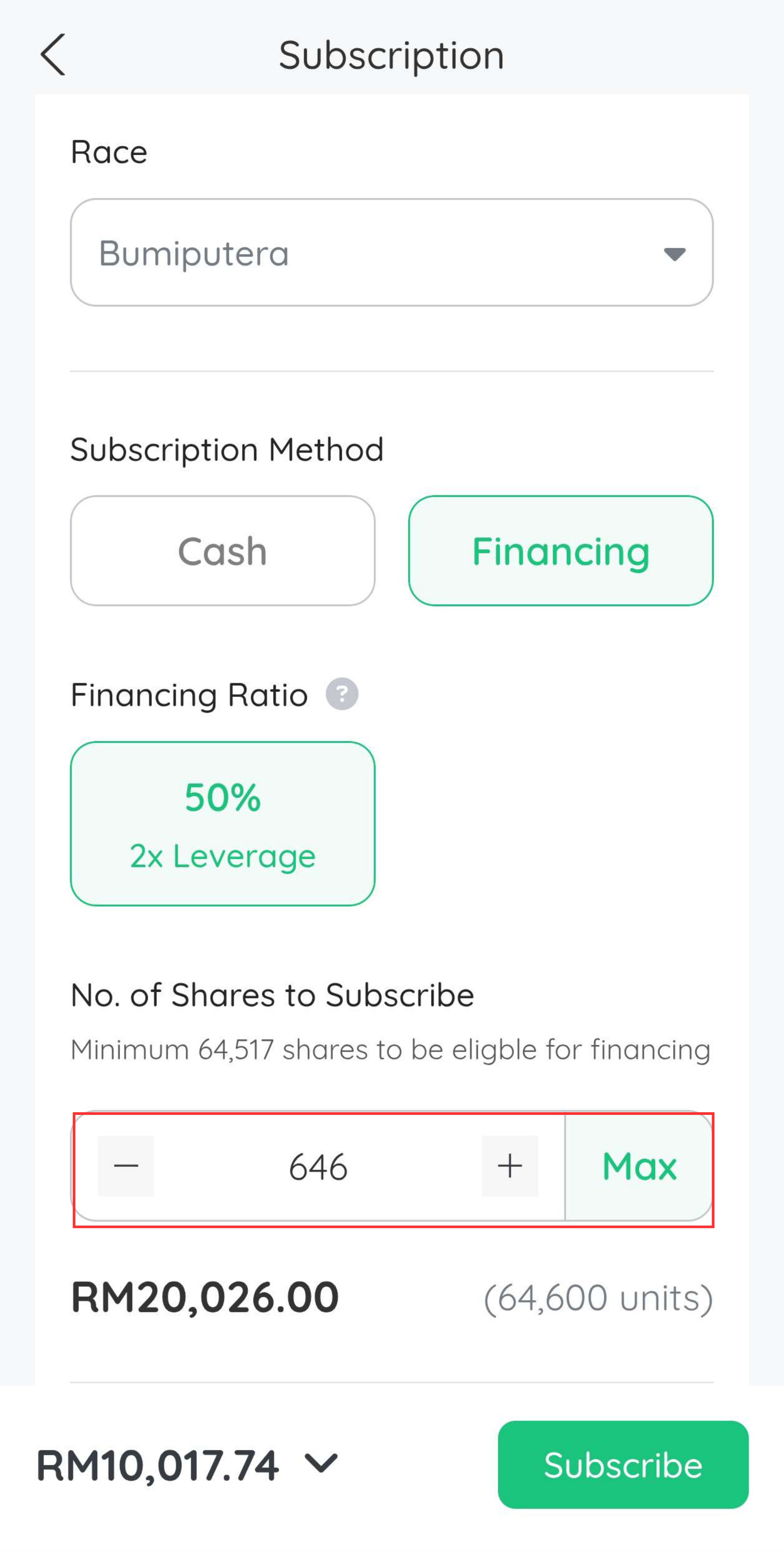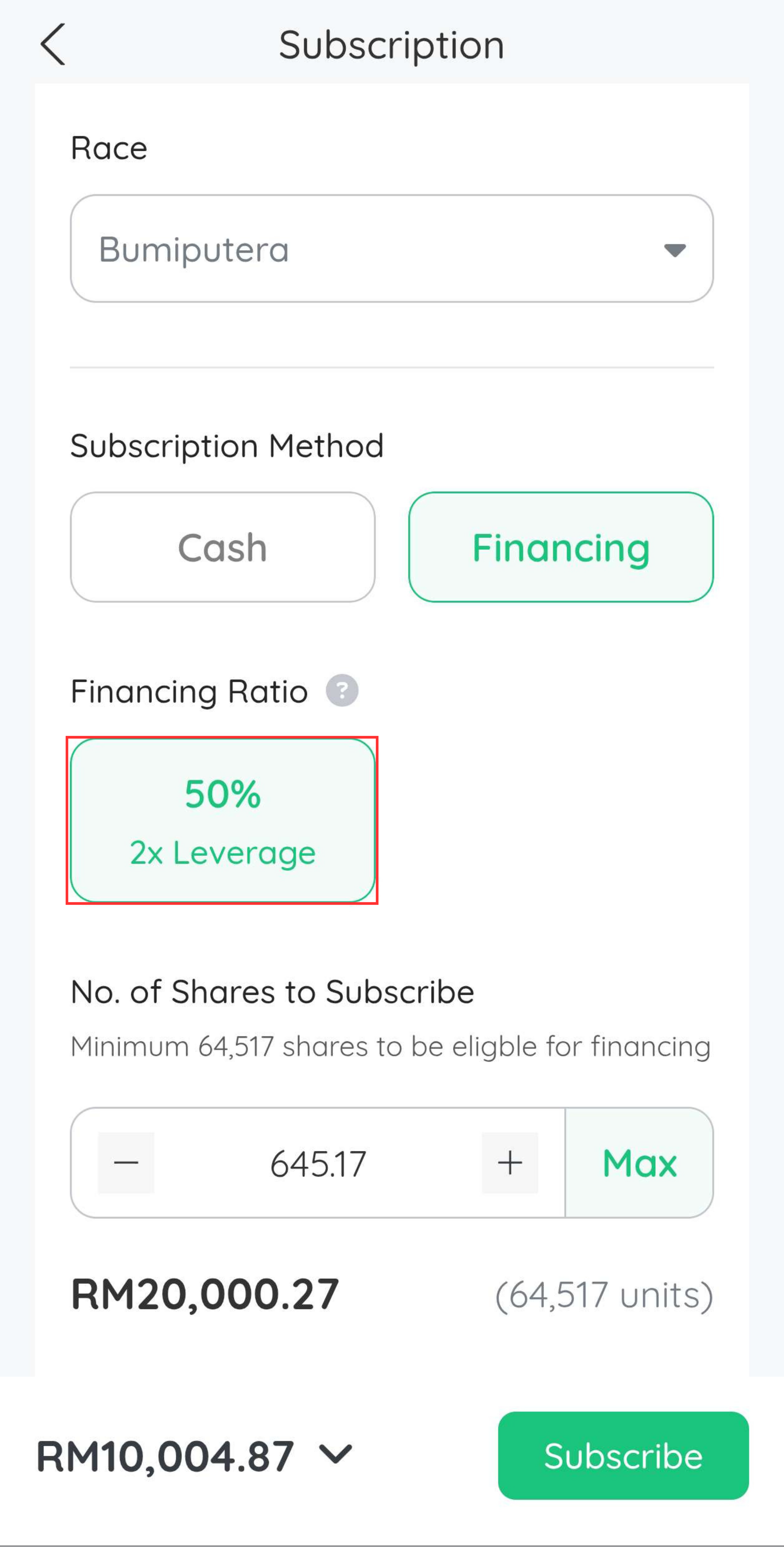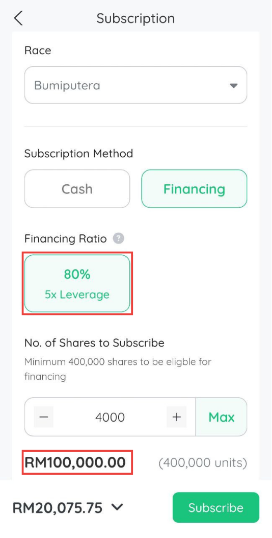 Pada bahagian ini anda akan dapat melihat Financing Ratio yang dibuka. By default, anda akan dipaparkan dengan pilihan 2x Leverage.