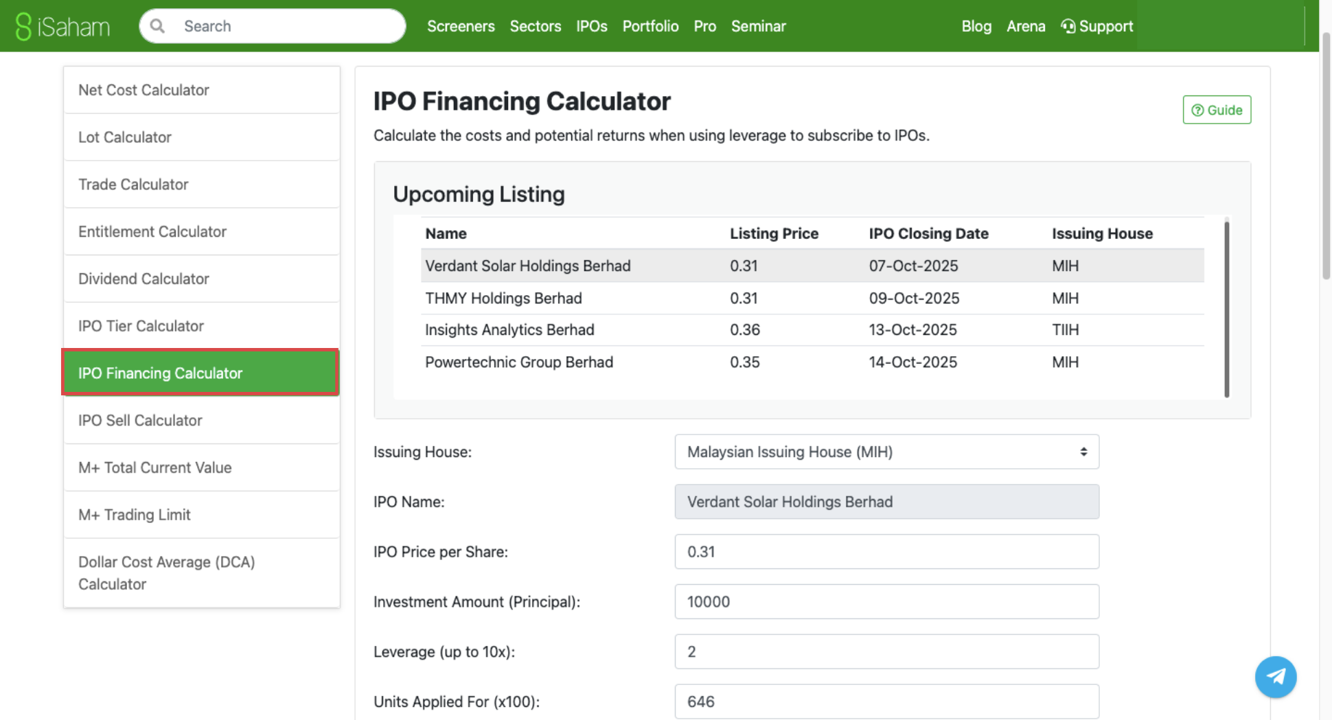 Anda boleh menggunakan kalkulator IPO Financing untuk membantu anda membuat pengiraan.