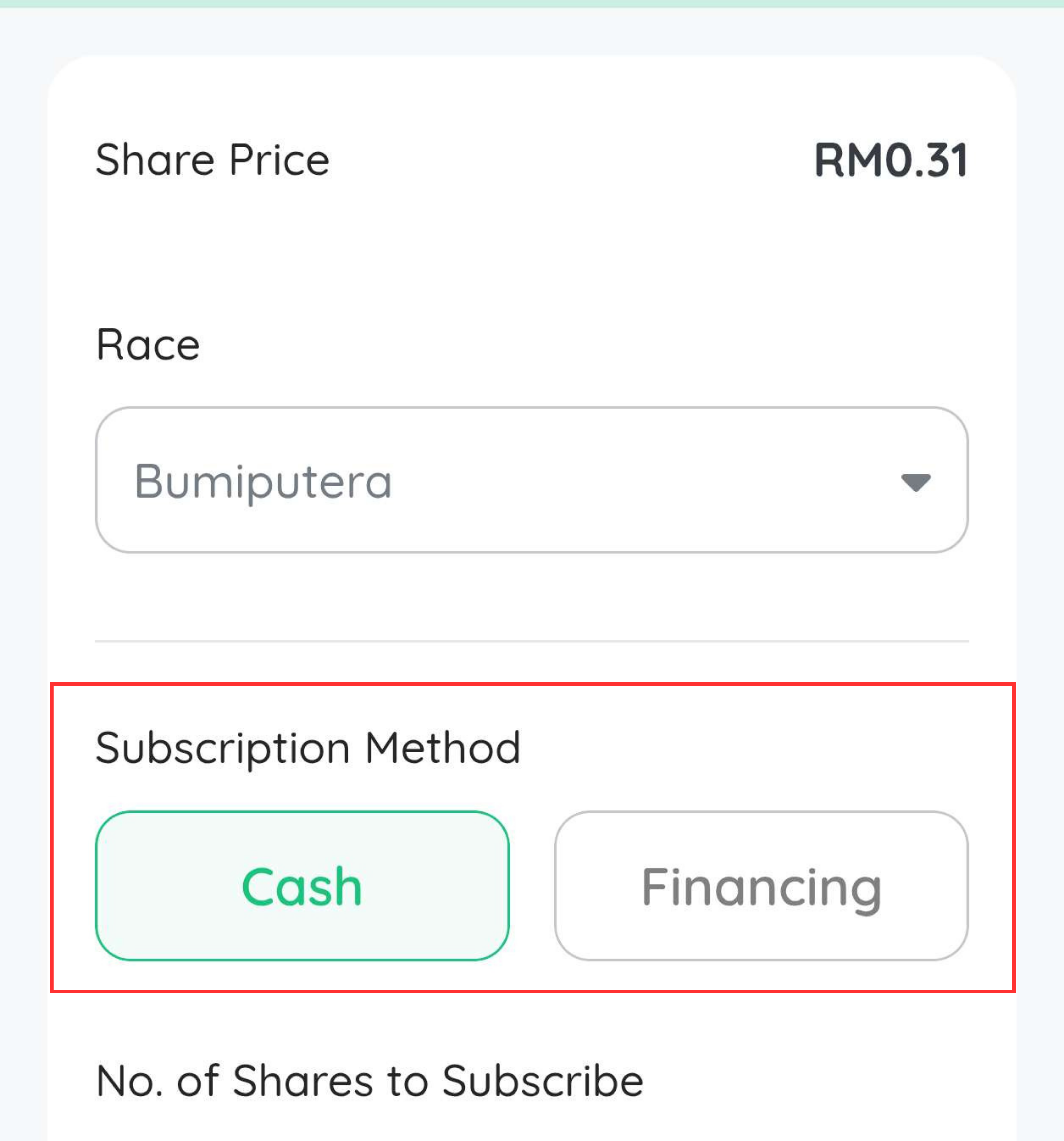 Langkah 2: Pada bahagian "Subscription Method" klik pilihan "Financing".