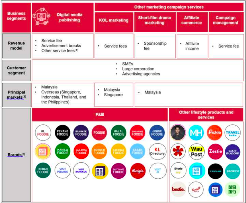 Penerbitan Media Digital (Digital Media Publishing): Ini adalah penjana pendapatan utama syarikat. Ia merangkumi penghasilan kandungan berbayar (sponsored content) dalam bentuk video, gambar, dan artikel untuk pelanggan, serta pendapatan daripada advertisement breaks pada kandungan video di platform media sosial seperti Facebook, Instagram, TikTok, dan YouTube.