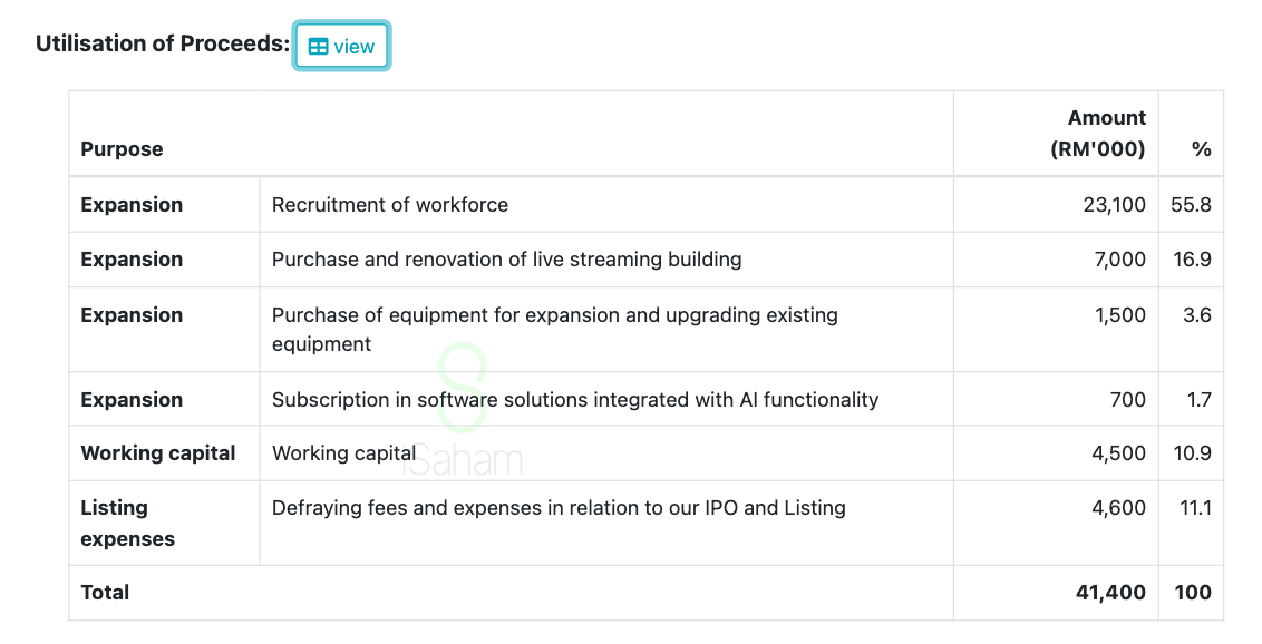 Tujuan utamanya adalah untuk mengumpul dana sebanyak RM41.4 juta bagi membiayai rancangan pertumbuhannya. Peruntukan utama adalah untuk pengambilan 190 kakitangan baharu (55.8%) dan pembelian serta pengubahsuaian bangunan untuk dijadikan pusat penstriman langsung (live streaming) (16.9%).