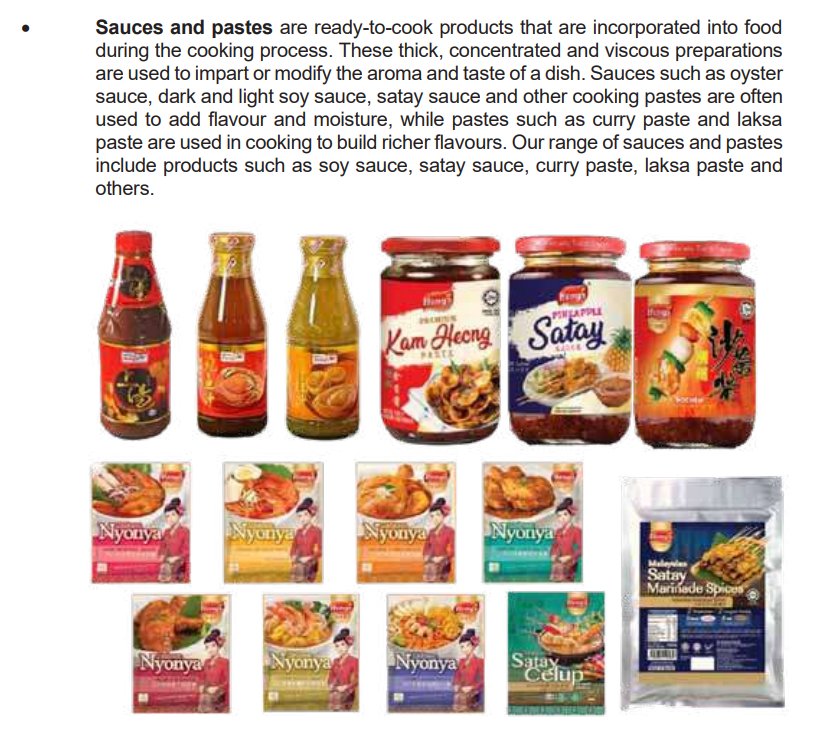 Termasuk sos, pes masakan, rempah dan bahan perasa di bawah jenama milik syarikat seperti Heng’s dan Makbest.