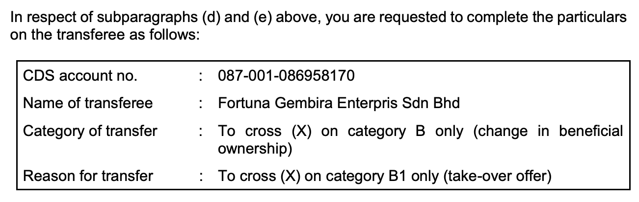 - Sebab pindahan: Tandakan B1 (Take-over Offer)