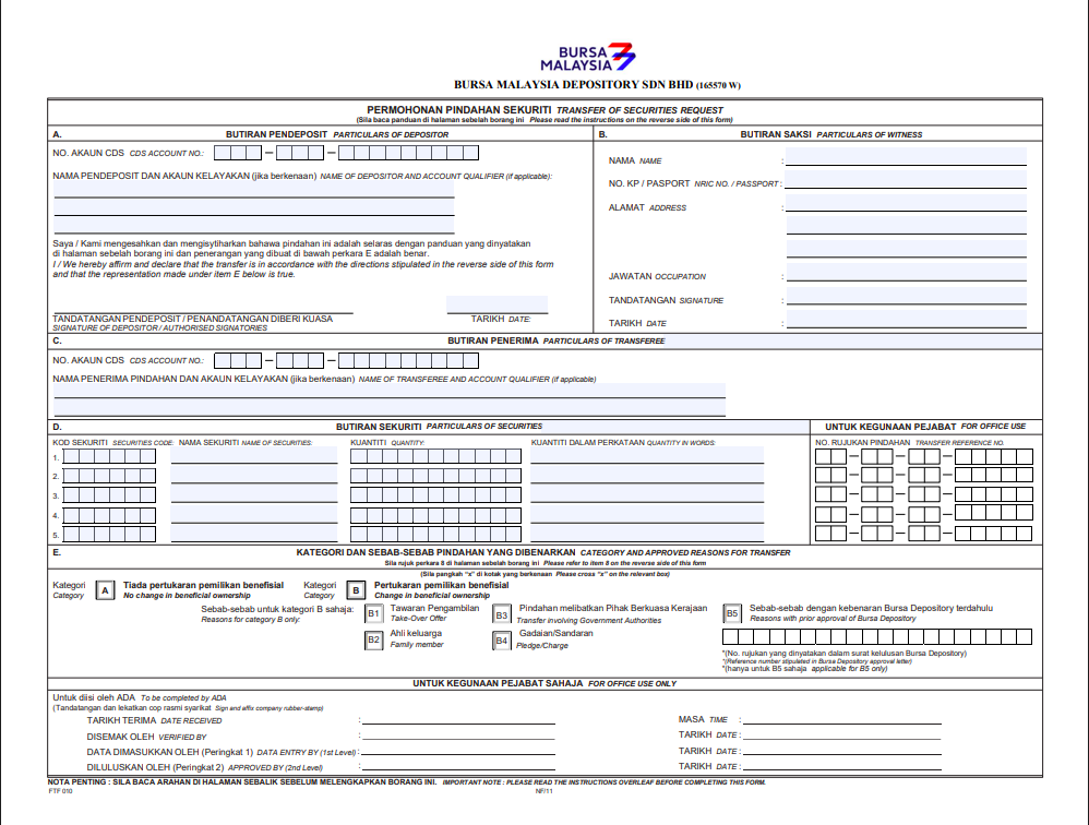 - Tiga salinan borang Transfer of Securities (FTF010 - Borang Pindah Milik Saham)