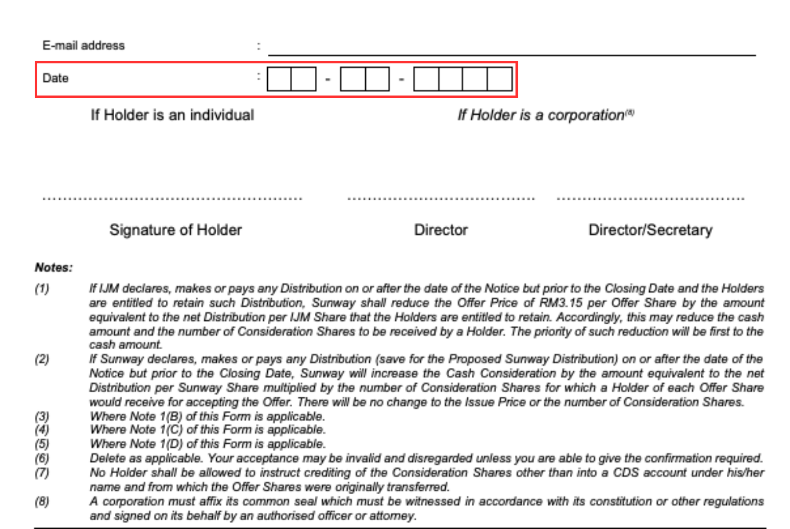 Borang ini berfungsi sebagai pengesahan bahawa anda bersetuju menerima tawaran. Contoh: Form of Acceptance Take-over IJM